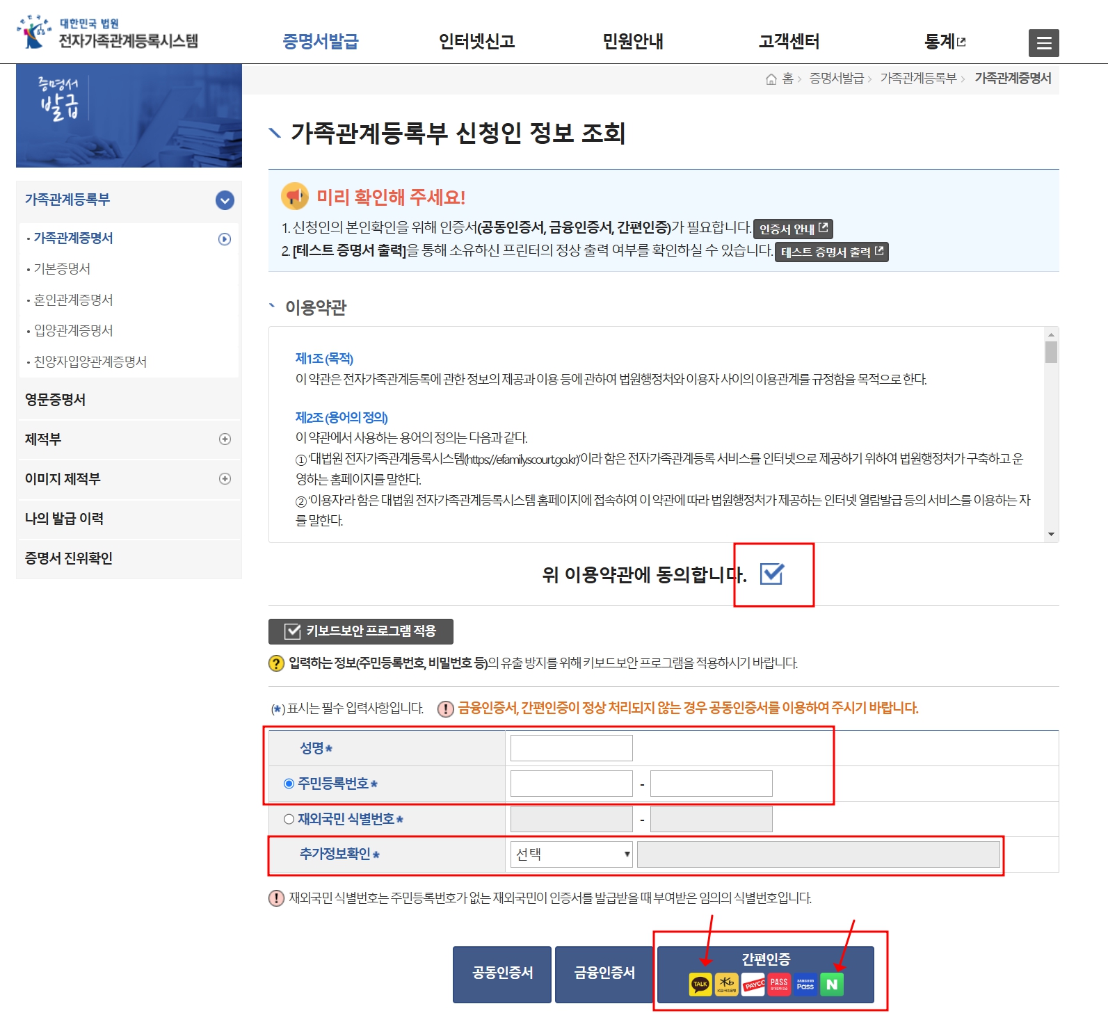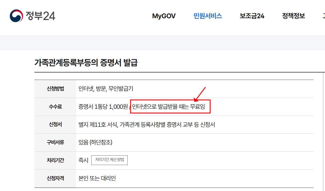 가족관계증명서 무료 발급 하기