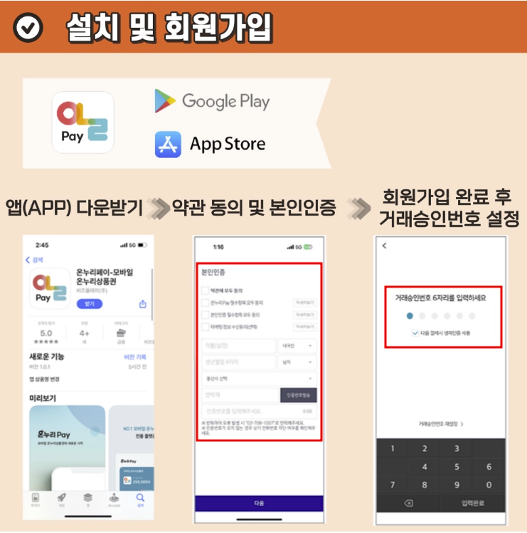 - '온누리페이' 앱 설치: 스마트폰의 앱스토어에서 '온누리페이' 앱을 다운로드하여 설치합니다.
