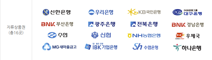 - 지류 상품권은 신한은행, 우리은행, KB국민은행, NH농협은행, 우체국 등 전국 16개 금융기관의 지점에서 구매 가능합니다.